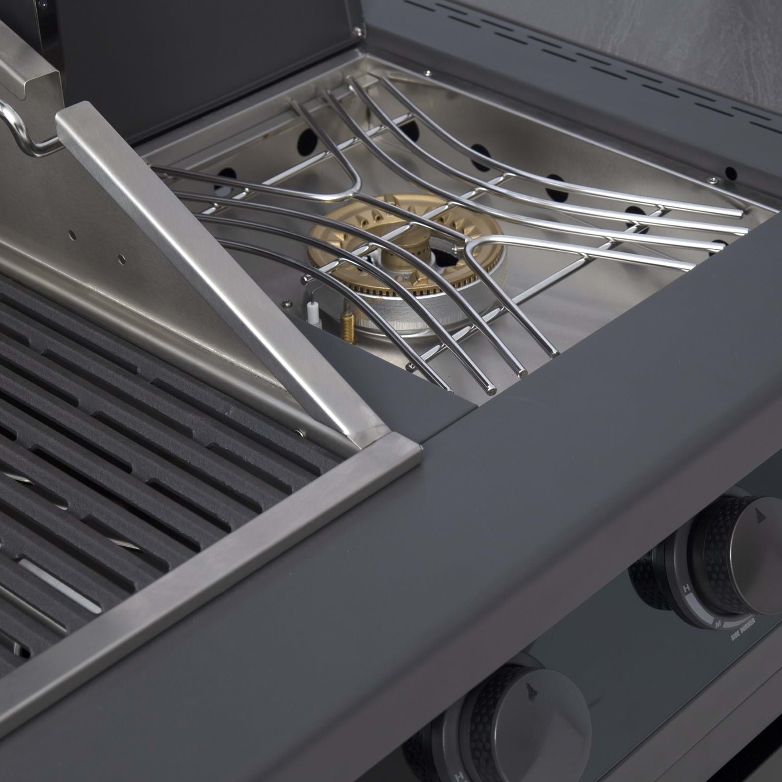 - Provides up to an impressive 114 MJ/h high heat output, with a total of six burners, a side burner, and a rear rotisserie burner